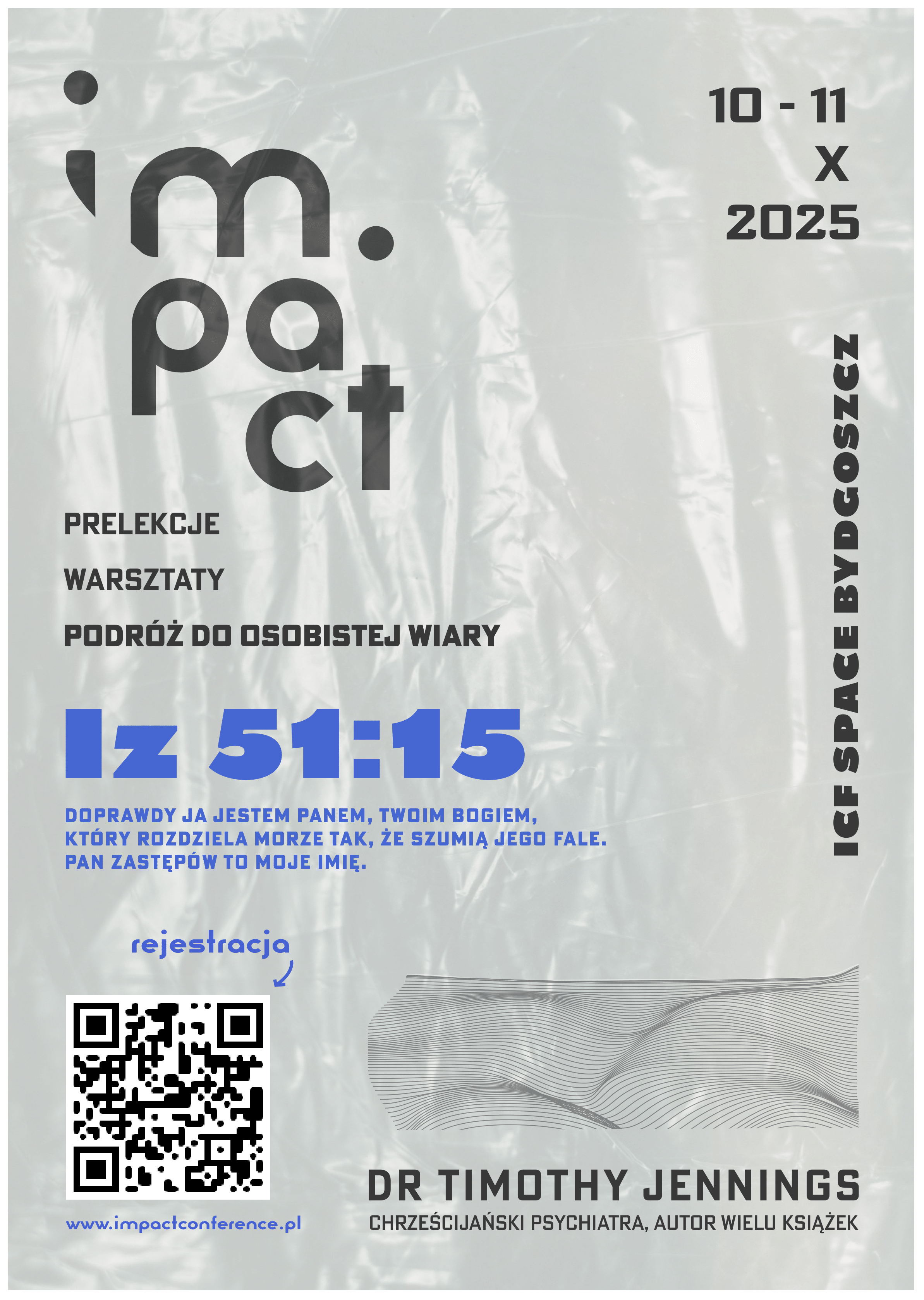 W tym roku odbędzie się Konferencja IMPACT w Bydgoszczy w dniach 10–11 października 2025 r., organizowana z ramienia Sekretariatu Ewangelizacji i Młodzieży Diecezji Zachodniej. Wydarzenie IMPACT to nowa inicjatywa, która będzie miała inny charakter niż tradycyjne zjazdy kościelne. Gościem specjalnym będzie dr Timothy Jennings – amerykański psychiatra i chrześcijański mówca.